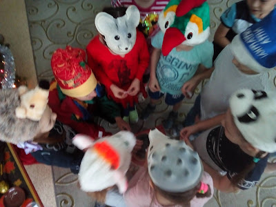 Дети нарядились в костюмы медведя, зайца, тигренка, петрушки. Ребята пришли в гости к Хозяйке, которая рассказала про историю этого праздника.Затем Марина Владимировна рассказала, как гадали на Святки: бросали валенок,